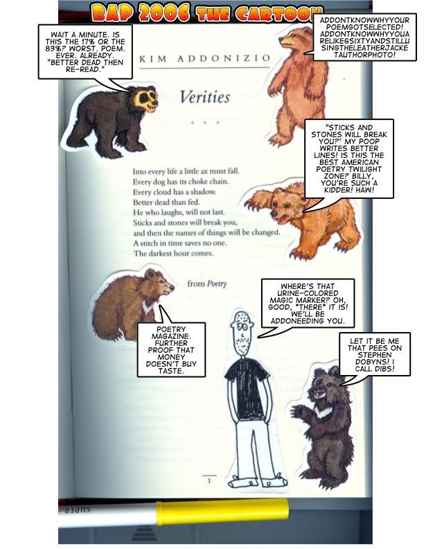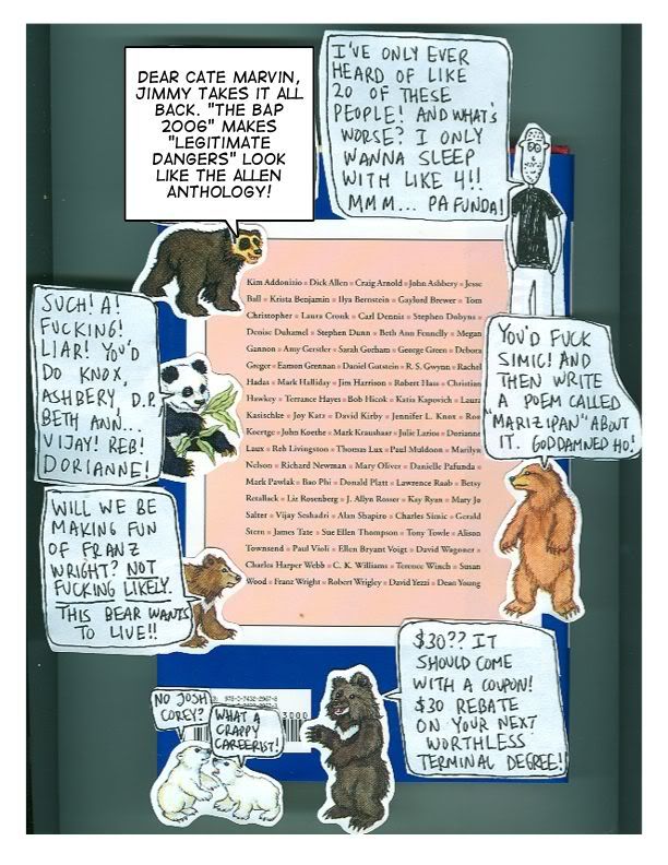 Well, because in general I don't think people should read poetry blogs. Or poetry, for that matter. The blogs themselves are most successful in showing what's wrong with us. I guess we're waiting on that ideal googler, that person who will just ramble along after having read one of our delightful poems in a magazine or having overheard our name at a party. And doop-de-doo, here they come, experiencing our blog for the first time. Buying all our products and services, reading everything we ever wrote in one sitting and