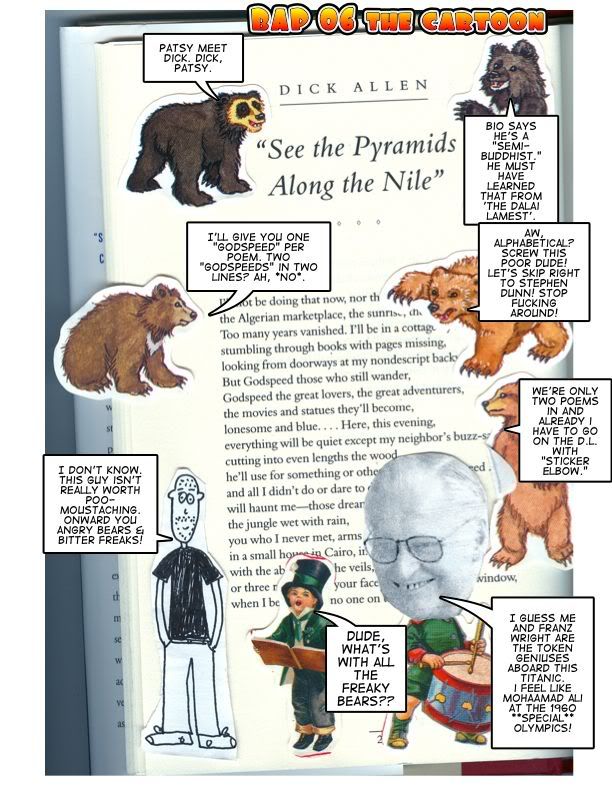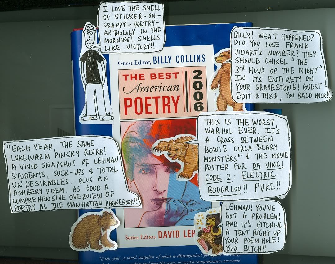 * You can tell what kind of poetry reading you're at by the response of an audience. Open mic slammers clap between every poem. Academic readings are deadly quiet, least you miss a semi-colon emoted from Seamus. Experimental poets smoke weed in the front row of their readings. It just depends. There's the heckling school, great when it's done well and lousy when it's not. But I write today in praise of that poetic hmmmmmm, given after a particularly piquant final line, a sort of tangible essence on the air as if someone was cooking turkey at the reading (and wouldn't that be something if they were?). It rises in the throats, requires a finger up across the considering jaw, and when done correctly gives everyone in the room a shiny feeling in their thorax that lasts a minute. Kind of the way some record store employees will clap furiously when they recognize a song that the band is playing 5 bars into what they're playing. That's "Jane of the Waking Universe!" they think to themselves. And they let the band know, secret Book House Boys eyebrow rub style. Clap clap clap!